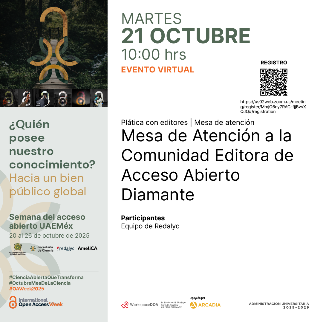 El 21 de octubre se llevará a cabo la Mesa de Atención a la Comunidad Editora de Acceso Abierto Diamante 2025, un espacio en el que editores de revistas científicas indexadas en el Sistema de Información Científica Redalyc y AmeliCA Conocimiento Abierto compartirán opiniones sobre el tema: ¿Quién posee nuestro conocimiento?